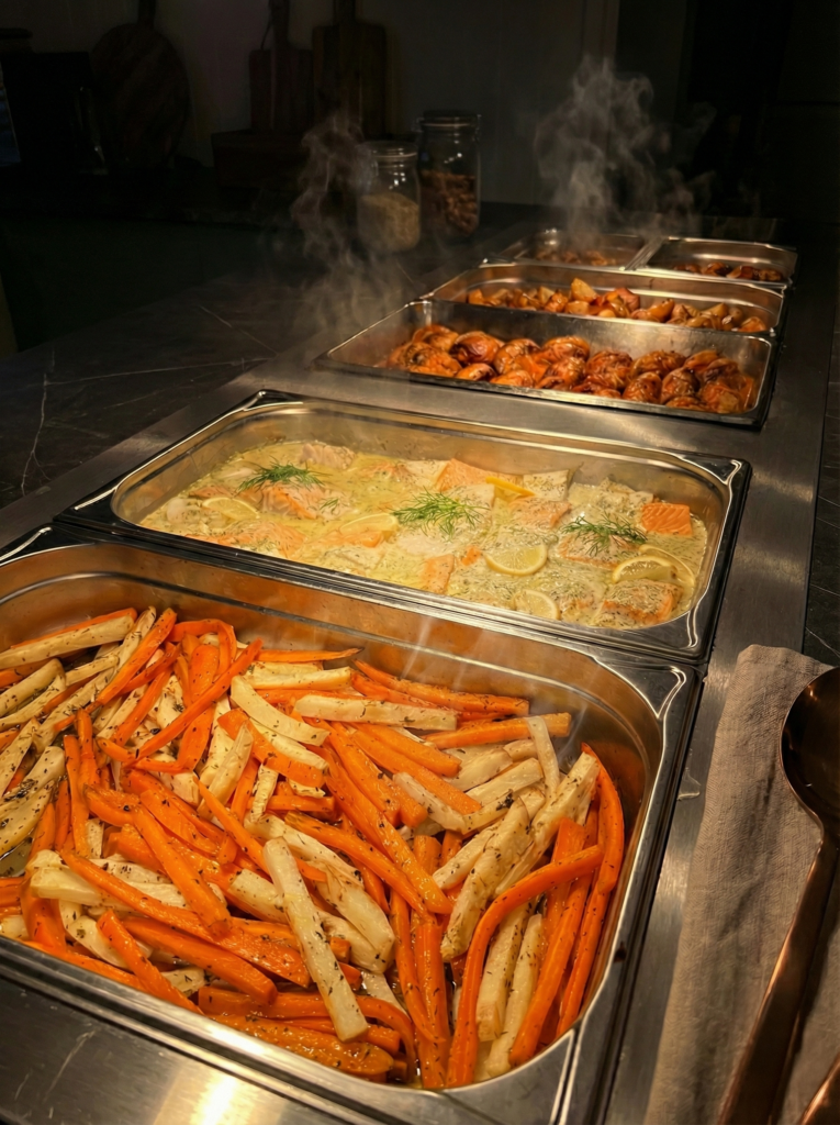 Sørgje for at matserveringsstasjonen ser rein og innbydande ut heile middagstida